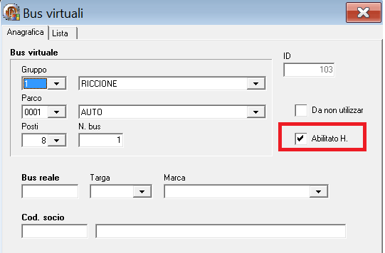 In archivi – Tabelle prenotazione – Tipo servizio, selezionare la pagina Altri dati ed inserire il colore che contraddistinguerà le corse del turno di linea. (rettangolo rosso)