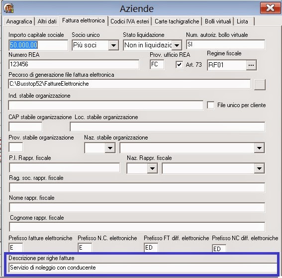 2. Il campo Descrizione per righe fatture (rettangolo blu) inseriva in precedenza, la dicitura prima della descrizione del servizio, sottraendone il numero di caratteri. on questa release invece, la descrizione viene inserita in apposito campo.