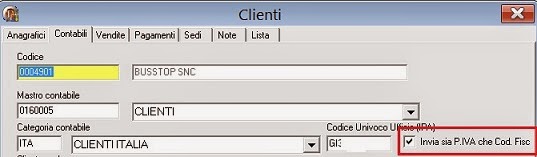 In Archivi – Contabilità Clienti – pagina Contabili, attivare il flag “Invia sia P.IVA che Cod. Fisc.”