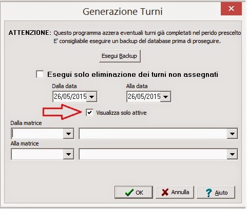 2) Nel programma Generazione turni è stato aggiunto il flag Visualizza solo attive (freccia rossa) che consente di filtrare le solo matrici attive.